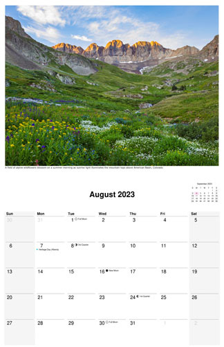 The images seen above are the images selected for 2023 and this is what you will get if you do not select your own images. But you do not have to accept the images that I have selected. You can create your own custom calendar with twelve images that you choose for the twelve months. Pick out any images on this website to incorporate into the twelve month calendar, and it will be custom printed for you. The images you chose will be sized and adjusted to fit in the top half of each page.